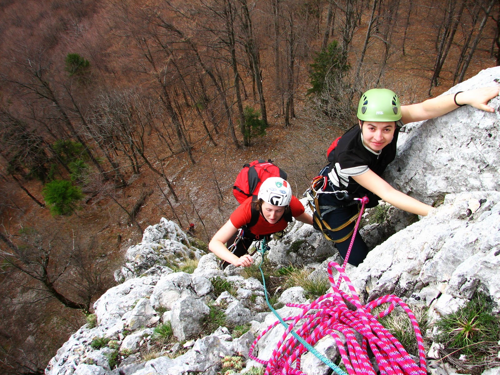 Ajunsi la baza peretelui, ne punem pe echipat, moment in care vine si echipa 2, formata din Batman si Robin x 2 care au zburat peste poteca si cu limbile scoase au ajuns la picioarele capritei. I-am indreptat pe drumul cel bun spre Panseluta si noi a inceput sa capatam altitudine, lungime dupa lugime pana in a-3 –a regrupare. Lungimea 4 ne-a cam taiat elanul tineresc, caci pe primii 20 metri am ajuns sa dansam ca Elvis, sa luam stanca la pipait, asa cu intimitate si sa ne intrebam daca o tine guma de la papuci. Ma rog, dupa ce fiecare a trecut cum a putut avand ca obiectiv depasirea a 4-5 spituri pana la coltanul salvator cocotat mult deasupra capului nostru, problemele s-au rezolvat, caci am iesit din nou pe muchie si ne-am regrupat lejer, feriti de vant, avand in fata o ultima lungime formala pana la copacul de regrupare.